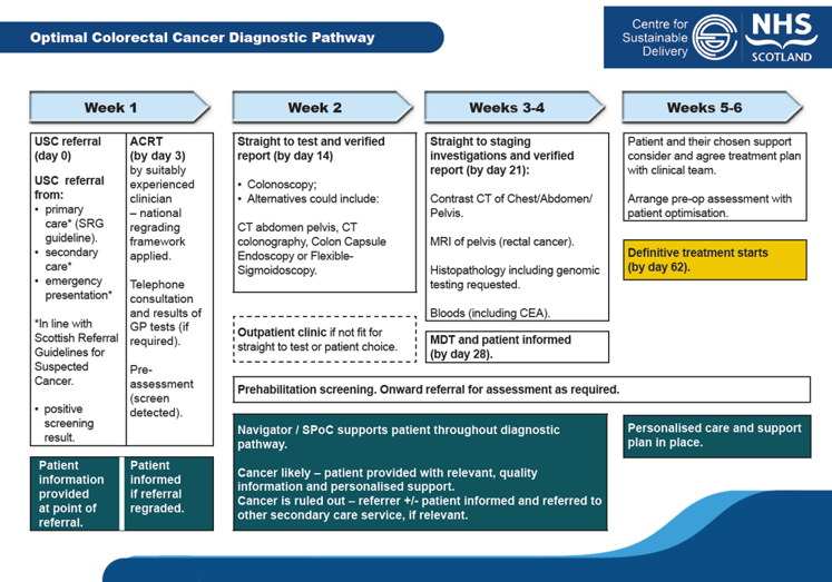 The NHS Scotland Optimal Colorectal Cancer Diagnostic Pathway is designed to diagnose, or rule out, cancer as quickly and efficiently as possible.